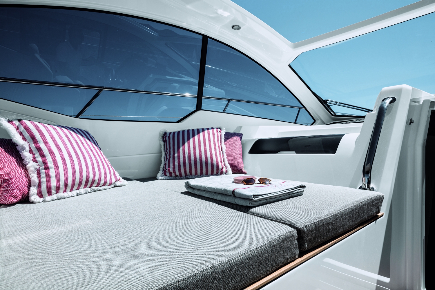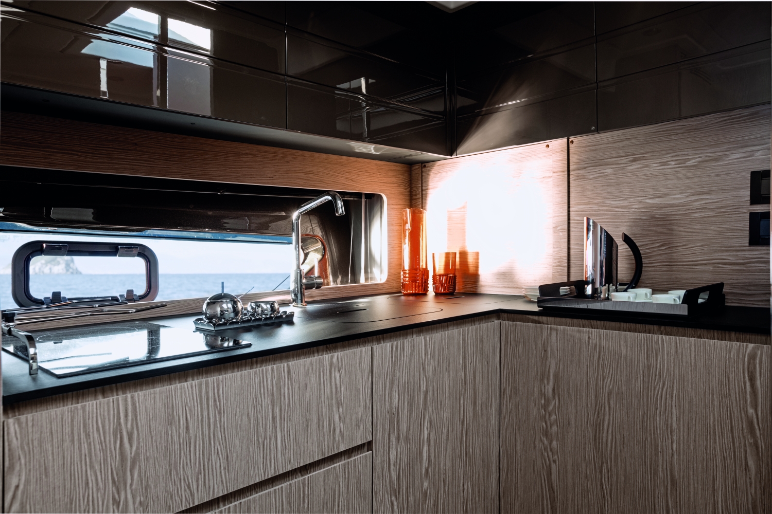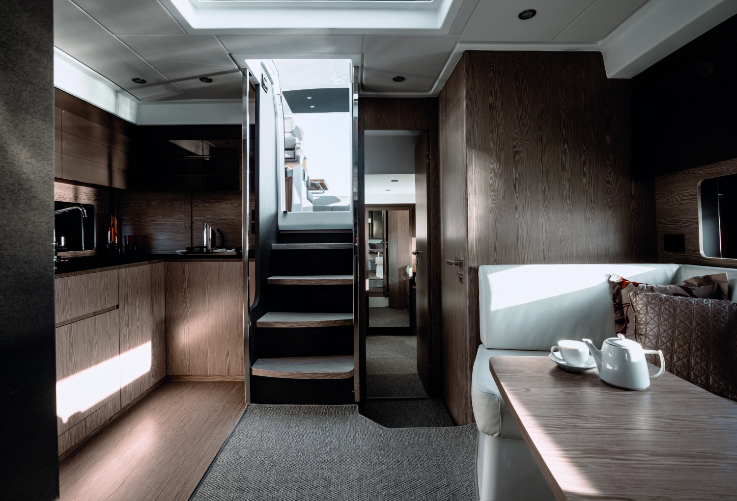 Well-organized living spaces create a liberating dynamic on the main deck, while spacious interiors evoke an airy, lively mood. Versatile design adaptations cater to diverse lifestyle demands, as the contrasting synergy of materials, from matte to glossy details, inspires a neat sense of style.